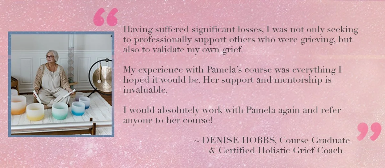 “I knew nothing about seeing Clients or grief work going into Pamela’s Holistic Grief Coach Certification Course. But I felt both seen and supported both in class and by her mentoring and got so much more out if than just an education on loss and grief. The power and practice of sharing her conscious tools in our group was deeply healing for me. And I’m so grateful Pamela helped me find the direction for holistic grief support work that is the perfect fit for me. Thanks to her encouragement and guidance I am on my way with the perfect business plan!” ~ AVC, Student